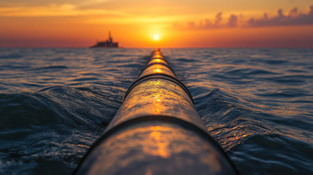 A sunset reflecting off the calm surface above a subsea oil pipeline