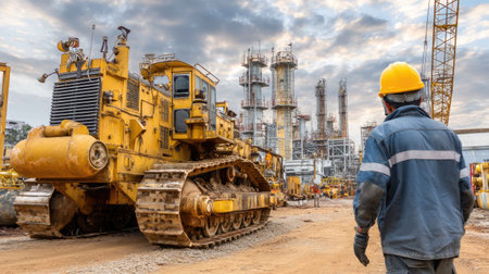 A worker in a yellow helmet walks toward a large bulldozer on an industrial site. The backdrop features a refinery with towering structures under a dramatic sky, showcasing the essence of heavy machinery in action.