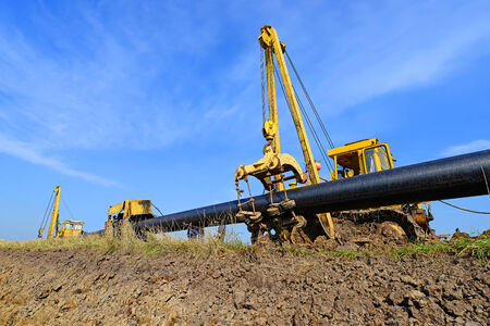 Natural gas pipeline construction work. Crawler crane with side boom Pipelayer Installation of gas and crude oil pipes in ground. Construct of the gas pipes to new LNG plant