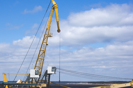 Port crane with yellow arrow against the blue sky and clouds. River port equipment for unloading ships and barges