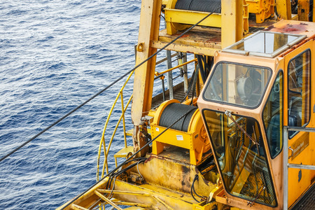 Cabin crane boom structure and metal sling on blue sky and sea background