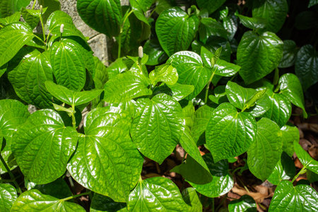 Top view of Wildbetal Leafbush (Piper sarmentosum Roxb.). Green leaves texture background. Herbal medicine. Natural source of calcium food from herbs leaves. Green leaves in jungle for organic concept
