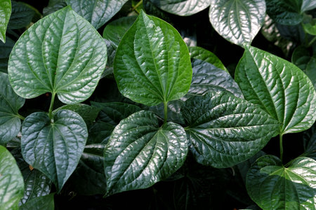 Fresh Green Heart-Shaped Betel Leaves Growing in Garden Soil, Close Up of Glossy Piper Betle, Aromatic Traditional Asian Herb and Herbal Medicine Plant