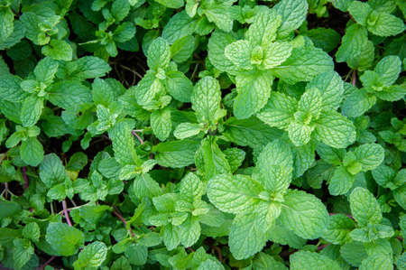 Closeup Fresh mint in herbs and vegetable garden