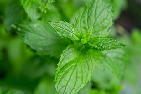 Close up of organic Mint leaves on the tree with blur nature background