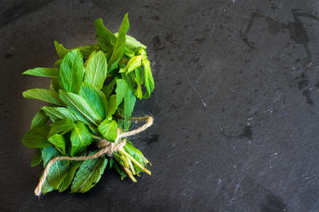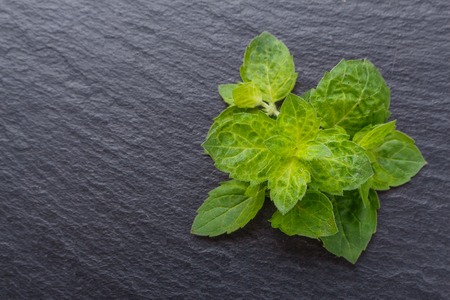 Fresh green mint on a black stone background