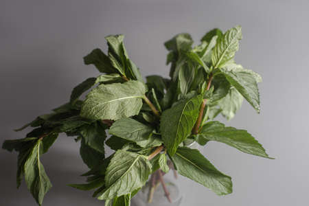 Fresh sprigs of fragrant mint on a gray background with copy space