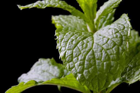 Low key macro photo of fresh mint leaf on black textured background. Selective focus