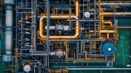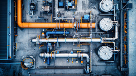 A detailed aerial shot showcasing a complex network of industrial pipes and machinery in a modern factory, highlighting vibrant orange and yellow components.