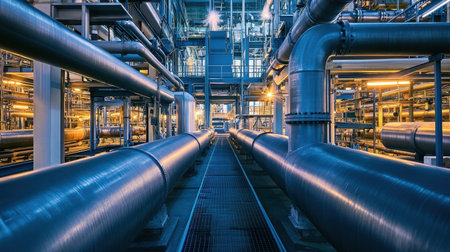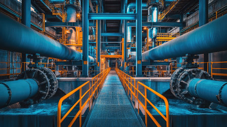 A captivating view of industrial pipes and machinery in a dimly lit factory, showcasing a stunning interplay of blue and orange lighting, highlighting the intricate details of the structure.