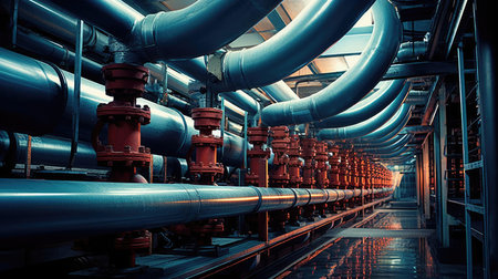 Complex arrangement of pipes and machinery highlights the artistry of industrial design through sleek lines and striking color contrasts.