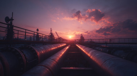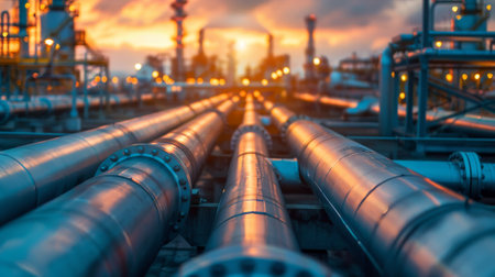 Industrial Pipes Reflecting Vibrant Sunset Colors at Oil Refinery Plant