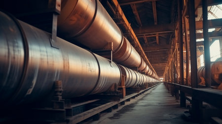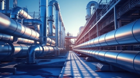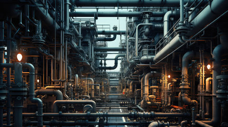 Industry pipeline transport petrochemical, gas and oil processing, equipment steel pipes plant. Generative Ai