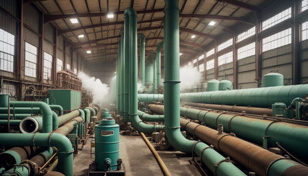 A vast interior of an industrial plant with a network of large green pipes and steam vents.. AI Generation