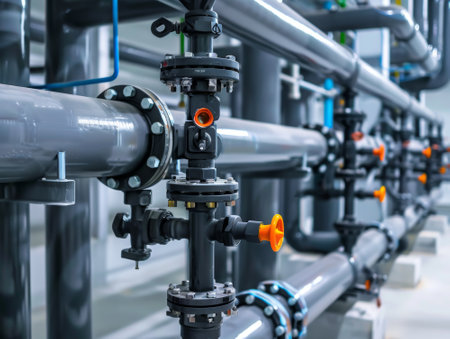 An intricate water supply system featuring sleek metal pipes and electrical components highlights the efficiency of modern industrial design.