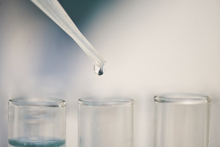 Close-up of a pipette with a droplet of water suspended at its tip, capturing the precision of laboratory work in a clean, modern environment