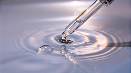 The image features a pipette dropper with clear liquid and bubbles, perfect for skincare or laboratory themes.