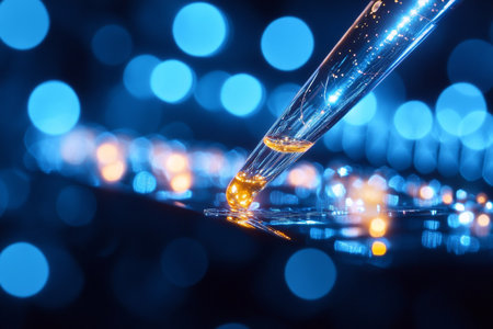 Pipette is delicately dripping liquid, forming perfect spheres of oil that glisten and reflect the warm golden bokeh in the background, creating a mesmerizing and luxurious scene