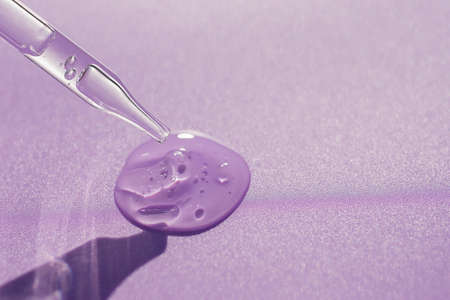 A pipette with a serum texture in close-up on a purple background.