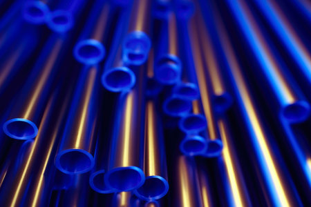 This captivating close-up image showcases a series of metallic pipes illuminated in deep blue lighting. The abstract industrial design highlights the intricate surface details, creating a visually striking effect suitable for various artistic and commercial uses.