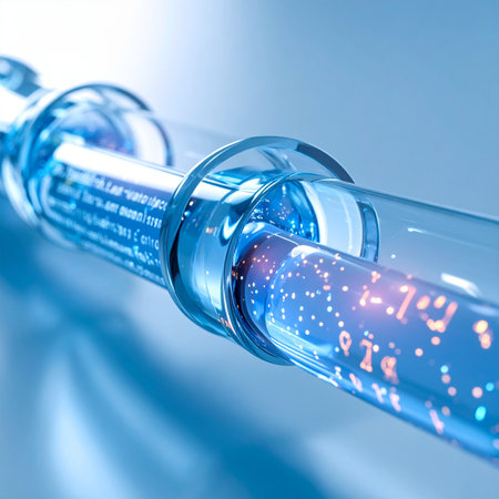 An artistic representation of glass tubes and metallic fittings set against a vibrant purple and blue light backdrop, conveying the essence of scientific exploration and innovation.