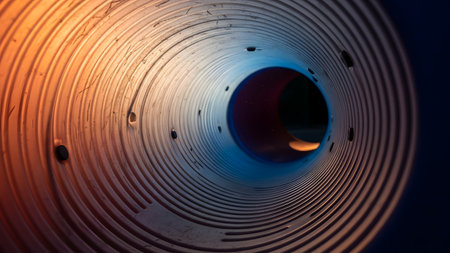An interior view of a ribbed corrugated plastic pipe illuminated with orange and blue lighting. The converging lines and circular texture create a futuristic, tunnel-like abstract composition.