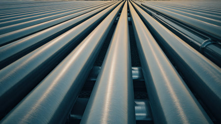 Close-up view of industrial pipes extending in parallel lines. This image captures the essence of engineering and technology within an urban environment, emphasizing structure.