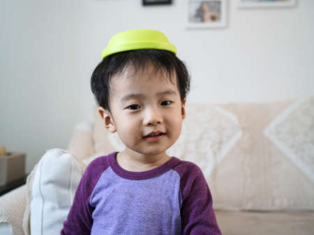 A year and sixth months old Asian baby with purple between ears playing with bucket