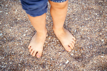 Close up of the bare foot of the child walking on stone pavement and copy space.