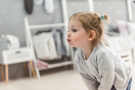 Portrait of beautiful pensive toddler girl with blonde hair at home. Sick kid sit in the bed. Scared little child in the room close-up. Sad baby is ill closeup. Healthcare concept
