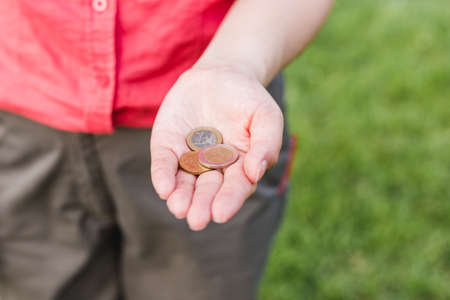 a childs hand on the background of asphalt. Little childrens fingers touch rocks on the ground.