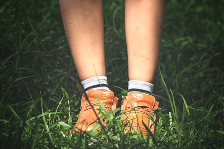 Closeup of girl legs feet in rain boots walking on meadow. Freedom, innocence and adolescense concept. Summer fun outdoor activity for children. Low angle view.