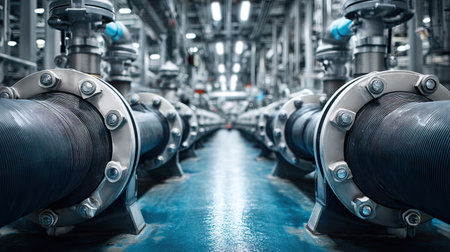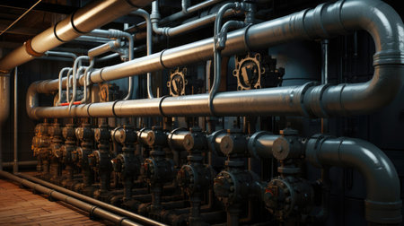 An expansive view of industrial pipes with metallic connections and valves, highlighting the intricate design and engineering of a manufacturing facility. Ideal for industry-related themes.