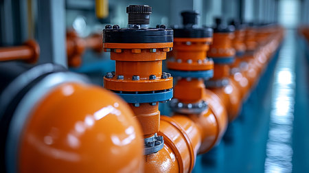Close-up view of orange industrial pipes and valves in a clean facility. The pipes are wet and reflective, showing a detailed view of connections and mechanisms