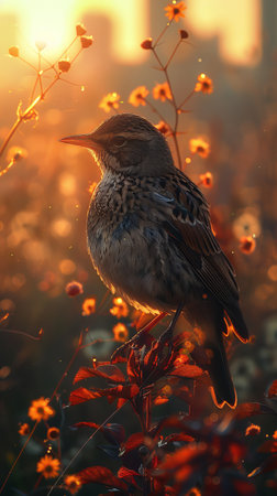 A small skylark bird stands in a sunlit meadow, singing with its beak open wide amidst a field of yellow, purple, and white wildflowers. The rising sun in the background creates a beautiful, warm glow, heralding the start of a spring or summer day.