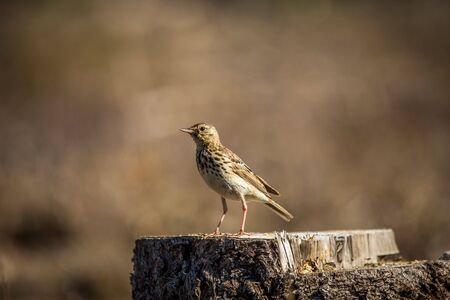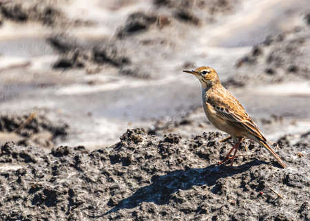 African Pipit sitting on a ground mound in the early morning sun with a blurred backgrounf