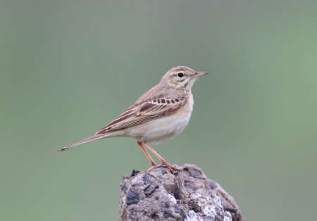 Close up and detailed photo of a tawny pipit (Anthus campestris) sits on a rock on green blurred background