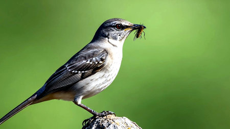 Mockingbird on a perch with a bug in its beak