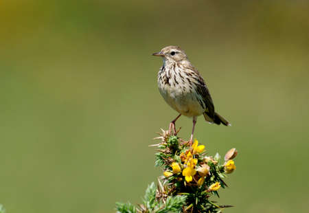 Meadow pipit, Anthus pratensis, single bird on gorse, Wales, June 2021