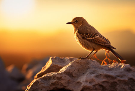 A stunning bird stands gracefully on a rocky surface, illuminated by a soft golden background. This serene moment captures the essence of nature's beauty and tranquility.