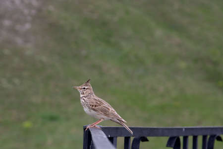 Lateral view of a Crested Lark resting in a city center of The Netherlands. In a urban area with a colorful background