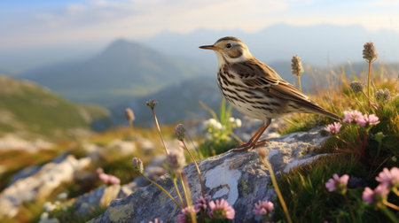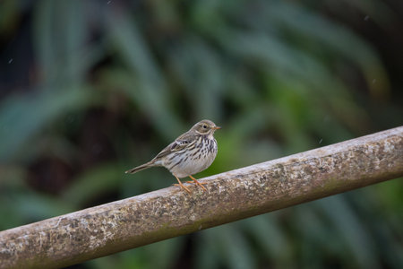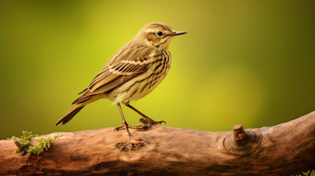 the american pipit perches on a weathered wood branch, its brown plumage and white eye stripes contrasting beautifully against a lush green background, showcasing its natural habitat in this stunning wildlife photograph, perfect for nature enthusiasts and birdwatchers. ai generated