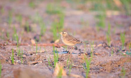 Tawny pipit is sitting on the ground.