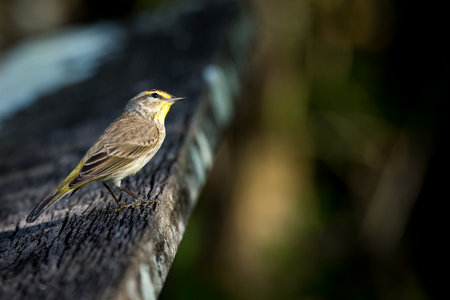 A selective of a Warbler bird on a wooden surface