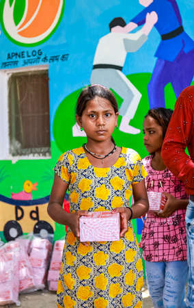 Noida, Uttar Pradesh, India - August 2021: Education, Portrait of Indian poor students from village or slum area standing outside the classrooms with food boxes at lunch time during pandemic.