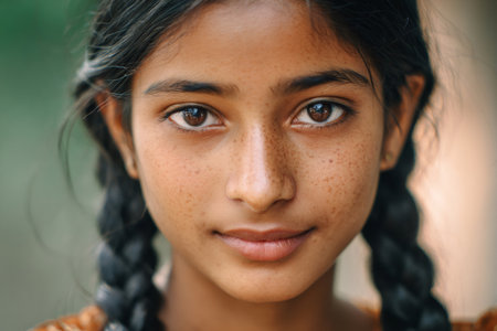 Young Indian girl with dark hair and freckled skin looking directly into the camera