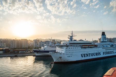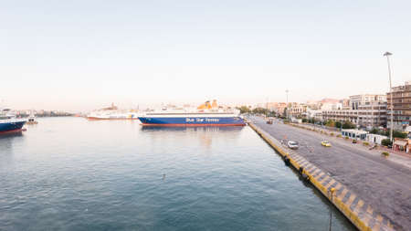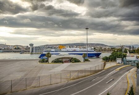 Pireas, Greece- May 12, 2015: Ferry boats, cruise ships docking at the port of Piraeus, Greece. The port of Piraeus is the largest passenger port in Europe and the third largest in the world.