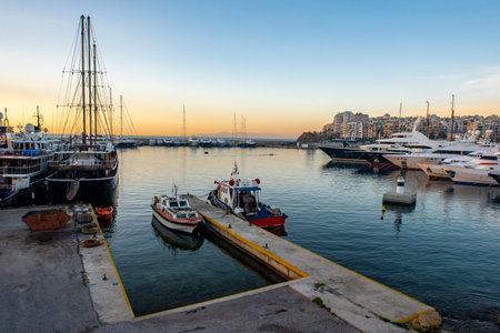 Heraklion, Crete, Greece - November 2, 2017: Old harbour of Heraklion with fishing boats and marina, Crete island, Greece.