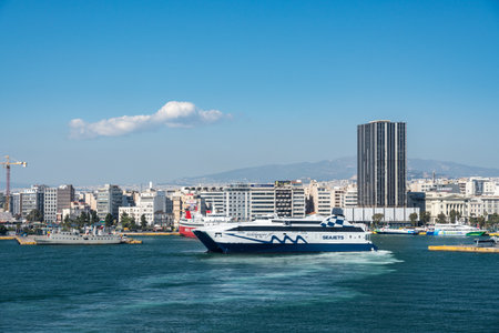 PIRAEUS, GREECE - 16 MAY 2019: Seajets ferry in the port of Piraeus near Athens