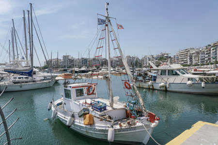 April 29, 2019. Marina Zeas in Piraeus, Greece. Fishing-boats ready to sail in blue calm sea. City and sky background.